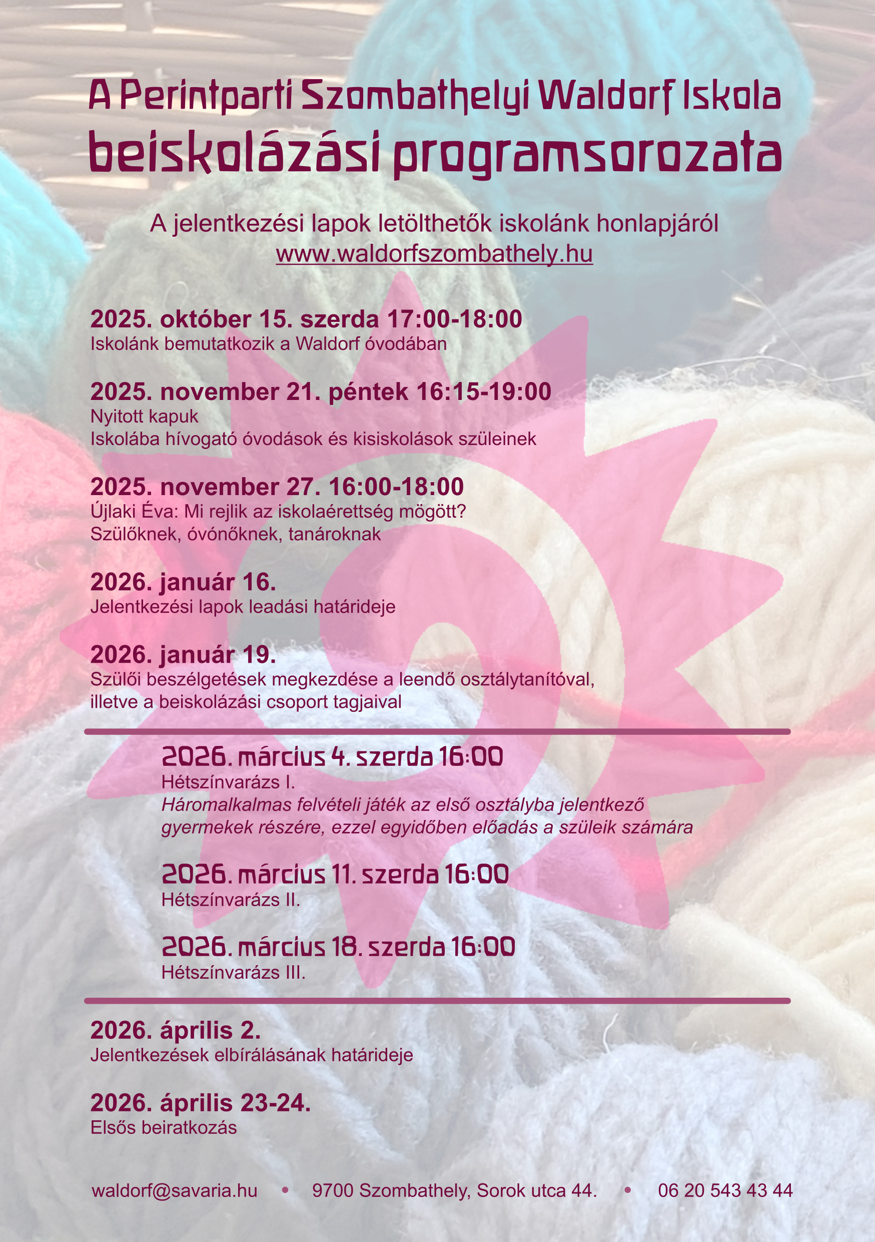 Iskolánk szeretettel várja az érdeklődő szülőket és gyerekeket a 2025–2026-os tanévre szervezett beiskolázási programjain. Az előadások, beszélgetések és játékos ismerkedések során bepillantást nyerhettek a Waldorf-pedagógia mindennapjaiba, és személyesen találkozhattok a tanítóinkkal.